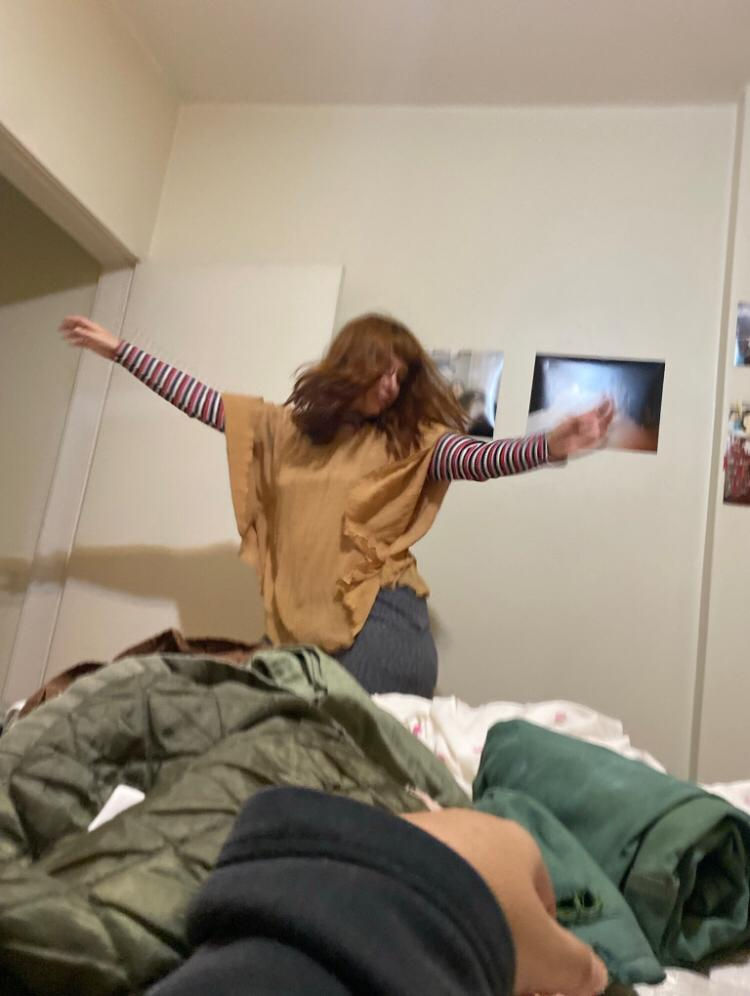 A picture of Ana Jannini (a white person with middle length red hair and short bangs) dancing. Behind her is a white wall with some pictures in it.